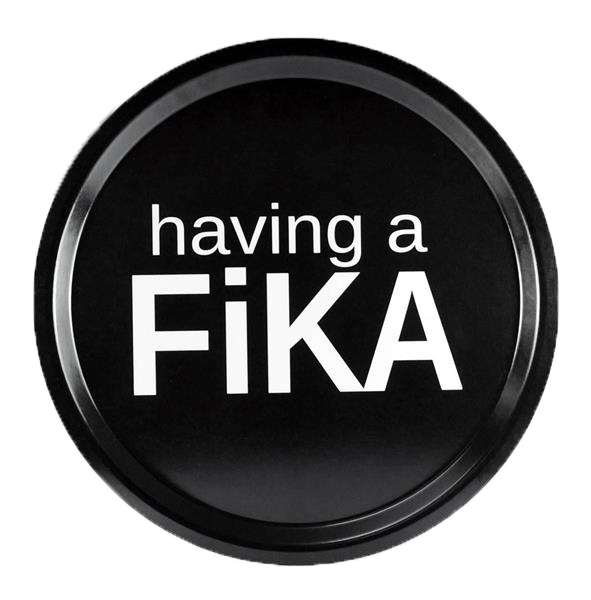 Bricka "Having a fika" (rund 31cm) (Svart med vit text)