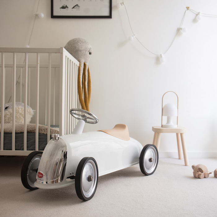 Rider är tillverkad helt i plåt och har stabila gummidäck som glider tyst över golvet. Den beigea sitsen är i mjukt stoppat PU-läder. En robust leksak som håller länge!